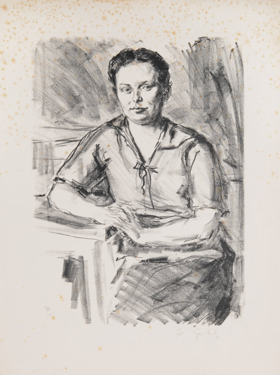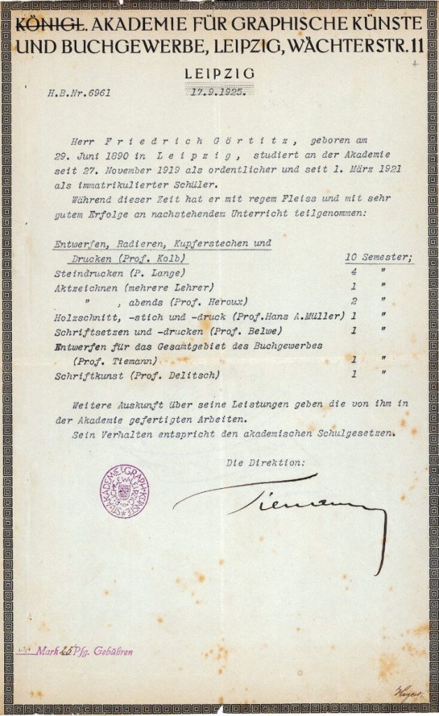 Vier Semester studierte Görtitz Steindruck an der Königlichen Akademie für graphische Künste und Buchgewerbe in Leipzig. Als er sein Zeugnis erhält, war sie bereits staatlich und auch Görtitz musste sehen, wie er in der „neuen“ Zeit über die Runden kommt. Woran es lag, dass die Lithogaphie nicht in den Fokus seines Schaffens rückte, bleibt heute im Dunkeln. Nur vier Werke sind insgesamt erhalten geblieben. Entstanden zwischen zwischen 1919 und 1920. Darunter das Portrait des Grafikers Kaufmann, seine erste Arbeit überhaupt in der Litho-Klasse an der Akademie.