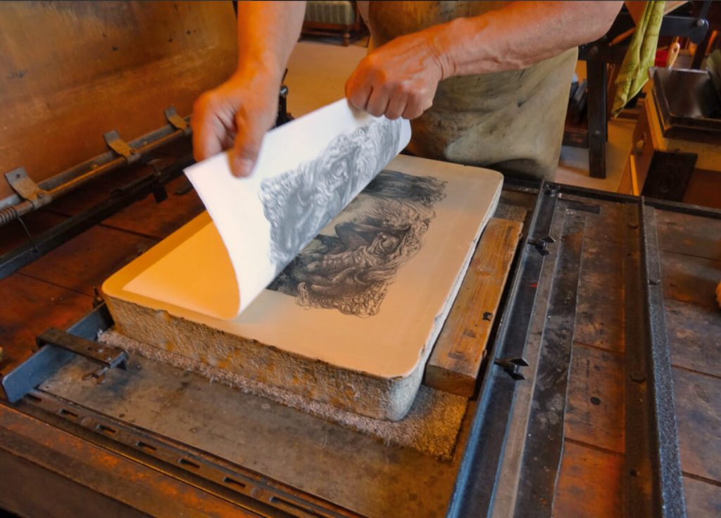 Der Steindruck, später Lithographie genannt, wurde 1798 von Alois Senefelder in München erfunden. Im Gegensatz zu den bis dahin bekannten Druckverfahren Hochdruck (z.B. Holzschnitt ) und Tiefdruck ( z.B. Kupferstich) beruht er nicht auf einem Relief, um druckende und nichtdruckende Partien zu trennen, sondern auf dem Gegensatz von Fett und Wasser.