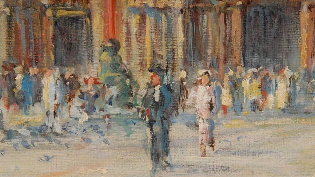 Wie der Künstler mit abstrakten Pinselstrichen die Besucher vor dem Markusdom darstellt, zeigt eindrucksvoll der hochvergrößerte Ausschnitt des Ölbildes der Piazza San Marco von Venedig.